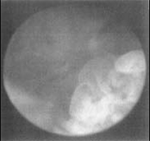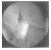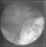 При очаговой гиперплазии эндометрия с изменением скорости потока жидкости в полость матки отмечалось волнообразное движение эндометрия. У 3 больных гистероскопию проводили при длительных кровянистых выделениях, чаще в дне матки и области устьев маточных труб, определяли бахромчатые обрывки эндометрия бледно-розового цвета. На остальном протяжении эндометрий был тонкий и бледный (рис.2 и 3).