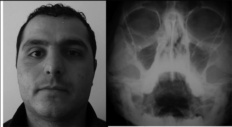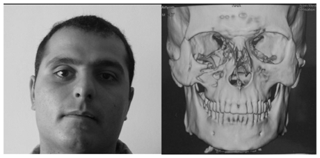 Больной К., 29лет. поступил в челюстно-лицевое отделение МЦ Канакер-Зейтун 22.09.09. с жалобами на деформацию средней зоны лица справа, затрудненное носовое дыхание, закладывание носа, нарушение чувствительности кожи подглазничной области, верхней губы, крыла носа, нарушение обоня-ния. 4 месяца назад получил травму, по поводу чего была произведена репозиция правой скуловой кости. Однако результаты лечения были неудовлетворительными. При поступлении в клинику лицо больного ассиметрично за счет западения скуловой кости и нижнего края глазницы справа и смещения правой половины носовых костей (рис.1а).