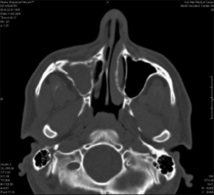 Кожа данной области без видимых изменений. Открывание рта свободное. Слизистая оболочка в области преддверия полости рта справа без изменений. На КТ снимке виден застарелый перелом правой скуловой кости со смещением отломков, носовых костей и передней стенки ВЧП справа (рис.1б), картина хронического травматического гайморита (рис.2).