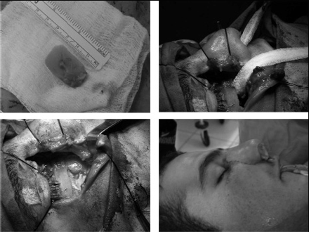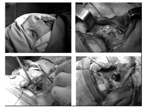 Рис. 3. Этапы контурной пластики подглазничной области, ревизии правой гайморовой пазухи с пластикой передней стенки ВЧП.