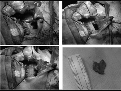 Обнаружили неправильно сросшиеся костные от-ломки, которые освободили от мягких тканей (рис.3.3), вскрыли переднюю стенку ВЧП (гис.3.4), произвели ревизию ВЧП, удалили инородные тела и патологические грануляционные ткани. Полость ВЧП промыли антисептическими растворами, соз-дали соустье между ВЧП и нижним носовым ходом. Произвели репозицию и фиксацию костных отломков костным швом (рис.3.5), нижний край глазницы восстановили АДКМ (рис.3.6), произвели тампонаду ВЧП. Дефект передней стенки ВЧП восстановили фрагментом кости передней стенки ВЧП (рис.3.7), который фиксировали на мембрану из пчелиного воска (рис.3.8). Костный фрагмент с пчелиным воском укладывали на дефект передней стенки ВЧП (рис.3.9). Мягкие ткани подглазничной области укладывали на свои места и прошивали узловыми швами полиамидной нитью 5,0, которые удаляли на 8-е сутки после операции (рис. 3.10).