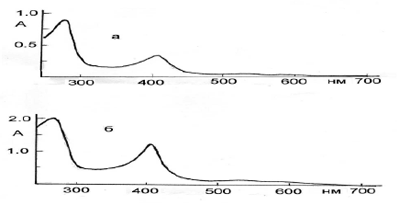 Оптический спектральный индекс (А412/А530) для цит b1558 составляет 7.5, а для цит b2558 - 10.0 (рис. 1). С другой стороны, отношение А280/А412 для цит b1558 составляет 2.6, а для цит b2 - 1.6 (рис. 2).
