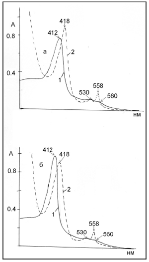 Рис.1. Oптические спектры поглощения изоформ цит b558 кислого характера: а – с повыщенной (до 95-100 кДа), б –