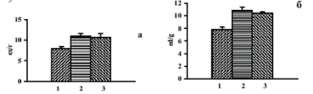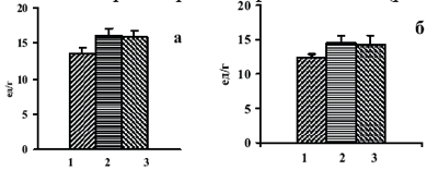 Рис.3. Фракции изоформ цит b1558 (а) и цит b2558 а – NADPH-зависимая О2¯-продуцирующая активность цит b1558 (1) после его часовой инкубации (по 0.2 мл,с Ао530=0,20) с БПП-1 (5 мкг, 0,5 мл) при 36о (2) и после гель-фильтрации b1558 с БПП-1 на сефадексе G-25 и концентрирования до прежнего объема (3). б – то жесамое для цит b2558.
