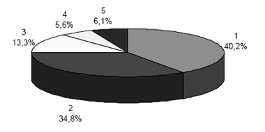 По литературным данным, в большинстве случаев матери детей, поступающих в дома ребенка, имеют более низкий уровень образования, чем у детей из семей. Нами были рассмотрены следующие градации фактора риска - ‘’образование родителей’’: неполное среднее (юные матери, учащиеся средних школ), среднее, среднее специальное и высшее. Каждый вид образования рассматривался отдельно по отношению к матери и к отцу ребенка. Суммарное влияние всех видов образования родителей на частоту соматической патологии оценивается величиной суммарной информативности воздействия равной 7,2, что соответствовало 1,5% от влияния всех медико-социальных факторов на соматическое здоровье детей. При этом наибольшую роль играл вид образования матери (J=5,3). Суммарная информативность влияния фактора ‘’уровень образования матери’’ на частоту соматической патологии распределилась следующим образом: