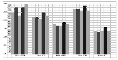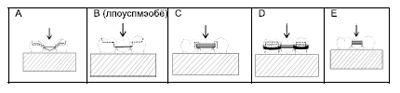 50 интактных жевательных зубов (по 25 премоляров и моляров), фиксировались парами в блоке, на расстоянии 10 мм, с помощью пластмассы холодной полимеризации, имитируя малый включенный дефект при отсутствии первого моляра [4]. Готовые образцы на 30 мин. помещались в воду при комнатной температуре (23+/-1С)(18011405-94) [6], извлекались из воды, просушивались, делились на 5 (А,В,С,Б,Е) групп в каждой по 5 образцов. В группе А опорные зубы препарировались тоннельным методом, с окклюзионной вкладкой. В группе В опорные зубы препарировались под вкладки (контрольная группа) [11], а в С группе контактные поверхности препарировались в виде вертикальных углублении (Гришин С.Ю.) [3]. В Б группе опорные зубы препарировались как при традиционных мостовидных протезах (КоЬакоу У.). В Е группе контактные поверхности крупнозернистым бором делались шер- ховатыми (рис.2).
