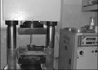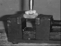 После соответствующего препарирования опорные зубы, протравливались, промывались, просушивались. Наносили адгезив пятого поколения, соответственно инструкции производителей. Так же следуя инструкции готовились и армирующие волокна, которые текучим композитом фиксировались на опорных зубах таким образом, чтобы в поперечном срезе коннектора обязательно находились по два волокона. На готовой основе делалась облицовка из микрогибридного композиционного материала. Обязательным условием исследования являлось со-блюдение одинаковой площади поперечного сечения волоконно-композитной балки в области коннектора и в центре тела протеза. После завершения работ все образцы помещались в термостат на 24 ч., при тем-пературе 37оС, а затем подвергались механической нагрузке. Акриловые блоки с зубами укреплялись в специальном модуле, установленном в универсальной испытательной машине. К середине тела ВАМП прикладывалась равномерная вертикальная нагрузка до разрушения протеза. Результат в абсолютных цифрах в килограммах фиксировался на циферблате [7] (рис. 3,4).