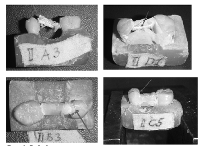 С помощью биомеханического моделирования нами было доказанно адекватное биологическое рас-пределение нагрузок на опорные зубы при этой ме-тодике. А вот способна ли такая конструкция выдерживать нагрузки, которые могут наблюдаться в же-вательном отделе зубных рядов, было выявлено с помощью лабораторных исследований. В лабораторных условиях сравнивали прочностные характеристики ВАМП, изготовленных существующими и предложенным нами методом препарирования опорных зубов.