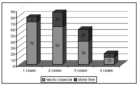 Всем больным до проведения ДУВЛ произво-дилось стентирование мочеточника на пораженной стороне. При отсутствии выраженного воспалитель-ного процесса стент устанавливали после 1-го сеанса ДУВЛ. У пациентов же с показателями бактериурии выше 106 степени стентирование производилось за несколько дней до 1-го сеанса ДУВЛ. После завер-шения сеанса ДУВЛ пациент находился в клинике в течение 1-2 часов, а затем выписывался. Пациенты обследовались через 1 неделю и при необходимости проведения повторных сеансов вновь поступали в дневной стационар. При проведении ДУВЛ мы при-держивались щадящих режимов дезинтеграции кам-ней. Среднее количество сеансов ДУВЛ на 1-го паци-ента составило 2,6±0,05 сеанса. Количество ударных импульсов составило 3250,81±24,36. Максимальный энергетический уровень составил 19,02±1,56. Коэф - фициент травматичности составил 4,5. На каждый сеанс ДУВЛ было затрачено в среднем 42,6±4,3 мин. 70-и пациентам всего было произведено 182 сеанса ДУВЛ. Из них 70-и пациентам произведено по 1 се-ансу (38,5% от общего числа сеансов), 62-м - 2 сеанса (34,1%), 38-и - 3 сеанса (20,9%) и 12-и - 4 сеанса (6,6%) ДУВЛ. В таблице 1 приведена общая характе-ристика сеансов у больных с КНЛ.