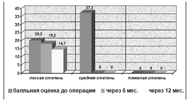 Таким образом, исследуемые группы по основ-ным показателям (возраст, соматический и гинеко-логический статус) были практически одинаковыми. Обнаружены лишь различия в гинекологическом анамнезе, которые выражались в достоверном увели-чении числа некоторых гинекологических заболева-ний в основной группе наблюдения по сравнению с контрольной, что явилось спецификой данного ис-следования. Анализ данных основной группы уже до гистерэктомии выявил значительные изменения в гинекологическом статусе, в частности, увеличениемменструальной кровопотери, сопрово-ждающееся низким уровнем гемоглобина, болевым синдромом, что часто приводило к ограничению ра-ботоспособности, нарушению функций некоторых органов и систем. Все эти изменения, несомненно, сказываются на состоянии здоровья и качестве жизни больных еще до оперативного лечения. Для вы-явления частоты и степени тяжести ПГС проведена оценка модифицированного менопаузального индек-са у женщин перименопаузального возраста, под-вергшихся гистерэктомии с придатками, с симпто-мами патологических изменений на фоне и без за-местительной гормональной терапии. Показаниями для хирургического вмешательства явились: миома матки у 82 (91,1 %), эндометриоз - у 21 (23,3%), ги- перпластические процессы - у 76 (84,4%) и опухоли яичника - у 9 (10%) обследованных. У большинства из них (81 женщины - 88,9%) имело место сочетание нескольких гинекологических заболеваний, требующих оперативного лечения. Следует отме-тить, что при опросе модифицированным менопаузальным опросником до хирургического вмешатель-ства некоторые женщины отмечали различные нару-шения психо-эмоциальной и вегето-невротической сферы, которые были расценены как климактериче-ские расстройства перименопаузального периода. В дооперационном периоде 32 (64%) женщины отме-чали нейро-вегетативные нарушения, а 13 (26%) па-циенток - различные психо-эмоциальные расстройства. После гистерэктомии первые проявления ПГС отмечали около 1/3 исследуемых женщин (32,2% - 29 женщин) уже в раннем послеоперационном пери-оде (с 4-е по 10-е сутки). Через 6 месяцев на фоне ЗГТ препаратом “Фемостон 1/10” у женщин первой группы наблюдалась выраженная тенденция перехо-да из средней степени тяжести в легкую. Значения ММИ до операции при легкой и средней степени тя-жести ПГС составили 20,2±0,9 и 37,3±0,6, в то время как после операции через 6 и 12 месяцев значения ММИ при легкой степени составили 18,2±0,9 (65%) и 14,7±1,5 (17,5%), соответственно, а средняя и тяже-лая степень здесь уже не регистрировалась (рис.1).