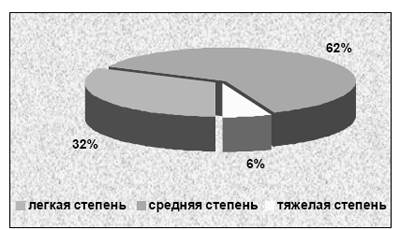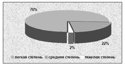 степень тяжести ПГС. Фактором снижения таковых могло послужить общесамотическое здоровье обследуемых женщин, так как в перименопаузальном периоде частота экстрагенитальных заболеваний зна-чительно выше, чем в репродуктивном периоде. Анализ частоты и степени тяжести ПГС в зависи-мости от соматического статуса пациенток показал, что у страдающих гипертонической болезнью, фиброзно-кистозной болезнью, ожирением, патологией желудочно-кишечного тракта и щитовидной железы более часто встречались тяжелые и средние формы постгистерэктомического синдрома, чем у пациенток имеющих другую экстрагенитальную патологию. Кроме того, ПГС развивался чаще и имел более тя-желую картину у женщин, имеющих сочетание двух и более экстрагенитальных заболеваний. Значительная часть пациенток с ПГС наиболее часто отмечали такие жалобы, как приливы различной интенсивности, в зависимости от степени тяжести синдрома, по-вышенная потливость, сердцебиение, раздражительность, плаксивость, депрессия. Было установлено, что средняя и тяжелая степень чаще (46,0%-23) наблюдались у пациенток, страдающими гипертони-ческой болезнью, фиброзно-кистозной мастопатией, ожирением, патологией желудочно-кишечного тракта и щитовидной железы. Выявлено также, что ПГС чаще (4%) развивался и имел более тяжелую картину у женщин, имеющих сочетание двух и более экстрагенитальных заболеваний.
