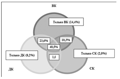 Рис.1. Распределение компонентов жизненных ценностей врачей (ВК – витальный компонент; СК – социальный компонент; ДК – духовный компонент)