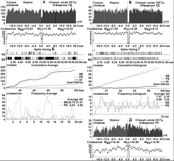 На рис. 1 представлены перистимульные гистограммы суммы спайков и диаграммы частоты спайков с усредненными значениями (А, В, Д) и детальный анализ потока спайковой активности (Б, Г) нейронов