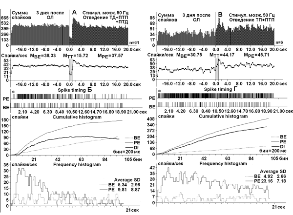 Следующий рис. 2 демонстрирует аналогичные эффекты спустя 3 дня после ОЛ при ВЧС (50 Гц) червя передней доли мозжечка с ТД (А) и ТП (В), сопровождаемыми ПТП в виде перистимульной гистограммы суммы спайков и диаграммы частоты спайков с усредненными значениями и детальным анализом постстимульных проявлений активности произвольно избранных нейронов ВЛЯ из числа представленных в А и В (Б, Г). Как видно из рисунка, имеет место еще большая выраженность ТД уже при 50 Гц, которая приближается к таковой в норме при 100 Гц. Здесь также крайне редко выявлялись ТП (В), как и в случае нормы.