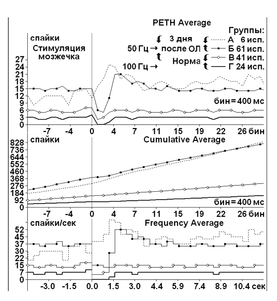 Наконец, на рис. 3 показаны усредненные перистимульные, кумулятивные гистограммы частоты тормозных, возбудительных и смешанных постстимульных проявлений активности нейронов ЛВЯ в норме и в условиях ОЛ на поврежденной стороне при ВЧС (50 и 100 Гц, 1 сек). Ясно просматривается фактически двукратное углубление ТД, сопровождаемое ПТП в случае ОЛ (Группа Б) по сравнению с нормой (группы В, Г), а также редкие эффекты ТП (Группа А).