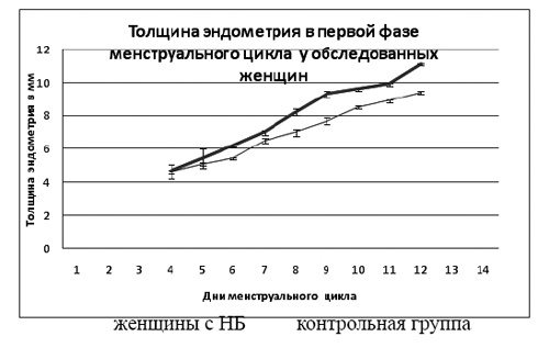 Динамическое измерение толщины эндометрия начинали с 4-ого дня ментруального цикла и проводили ежедневно. Толщина эндометрия на 4 день ментруального цикла (д.м.ц.) составила в среднем 4,7±0,1мм у женщин контрольной группы. В дальнейшие дни происходило линейное увеличение толщины эндометрия. Максимальная толщина эндометрия регистрирована на 12 д.м.ц. и составила в среднем 11,4±0,2мм у женщин контрольной группы. У пациенток с НБ на 4 день менструального цикла толщина эндометрия статистически достоверно не отличалась от данных контрольной группы, составляя в среднем 4,6±0,1мм. С 5 дня менструального цикла регистрировано линейное увеличение толщины эндометрия, как и у пациенток контрольной группы. Максимальная толщина эндометрия в группе женщин с НБ составила в среднем 9,4±0,1мм на 12 день менструального цикла.