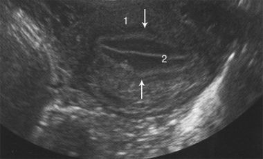 Рис. 2. Трансвагинальная эхограмма трехслойной картины эндометрия (поперечное сканирование): 1. матка, 2. эндометрий