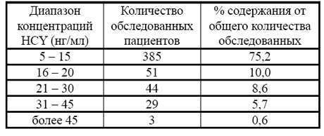 В табл. 2 приведены результаты тестирования гомоцистеина (ИСУ) в сыворотке крови пациентов лаборатории “Диаген Плюс” за период 01.04.2009 - 30.11.2010 гг. (К - 512).