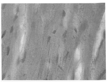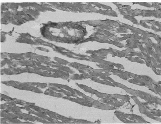 Межклеточная рыхлая соединительная ткань отечна и при окраске по Ван-Гизону приобретает желтоватый оттенок. На срезах, окрашенных методом Селье, выявляются очаги «фуксинофильной дистрофии» миокарда. Метод использован для выявления ранних морфо-функциональных сдвигов со стороны миокарда. «Фуксинофильная дистрофия» выявляется не только при нарушении кортикостероидного и электролитного обменов, но и при других патологических состояниях. Через 24 часа после декомпрессии местами выявляются грубые изменения проводящих кардиомиоцитов. Отдельные мышечные волокна, где гомогенизация распространяется и на саркоплазму, представлены в виде гиалиноподобных обра-зований.