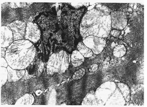 Для электронно- микроскопического исследования фрагменты органов толщиной не более 1мм фиксировали в 2% р-ре глютарового альдегида на 0,2м какодилатном буфере (рН 7,4) при температуре 40С в течение 2 ч, после чего образцы промывали 0,15М какодилатным буфером (рН 7,4) с добавлением саха-розы (3 порции в течение 0,5 ч) и подвергали постфиксации в 1% р-ре четырехокиси осьмия на 0,2М какодилатном буфере (рН 7,4). Дегидратацию мате-риала проводили в ацетонах возрастающей концентрации. Заливку осуществляли в смеси эпона и аралдита по Mollenhauer (1964). Полутонкие и ультра- тонкие срезы готовили на ультратоме LKB (III тип, Швеция). Полутонкие срезы окрашивали пиронином и толуидиновым синим и просматривали под свето-вым микроскопом. Ультратонкие срезы контрастиро-вали цитратом свинца по Рейнольдсу и изучали с помощью электронных микроскопов JEM -100В и JEM- 100 СХ.