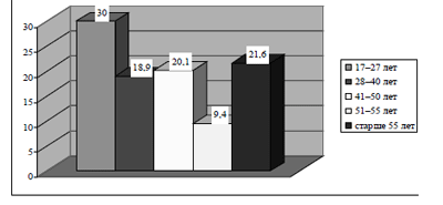 Из собранных статистических материалов формировались базы данных для оматизированной обработки с использованием прикладных программ Microsoft Excel, которые успешно могут применяться в любом лечебно-профилактическом учреждении при проведении мониторинга удовлетворенности пациентов качеством медицинской помощи. Среди принявших участие в анкетировании мужчин было больше, чем женщин (р‹0.05). Повозрастная структура анкетируемых представлена следующим образом (рис.1).