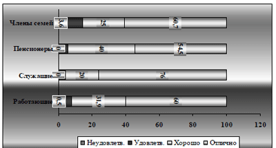 Их доля в целом составила 8.1%. В этой группе 72.0+8.9% пациентов были не удовлетворены состоянием помещений госпиталя, кроме того, в 76.0+8.5% случаев негативное отношение было связано с оценкой уровня оснащенности медицинским оборудованием (аппаратурой). Наиболее низкие оценочные уровни были определены в отношении состояния помещений (3.8-4.1 балла). По уровню оснащенности оборудованием средние оценки составляли 4.3-4.5 балла. Оценка доступности медицинской помощи как одной из характеристик ее качества является очень важной, поскольку имеется сильная корреляционная зависимость (г=0.82) с уровнем общего интегрального коэффициента Куд. Большинство респондентов (до 65-66%) оценивают уровень доступности медицинской помощи как «хороший» и «отличный». Однако доля пациентов, оценивающих фактор доступности как «удовлетворительный», достаточно большая и по отдельным группам респондентов составляет от 28.1% до 32.0% без значимых статистических различий (табл. 3). Подробный анализ ответов респондентов различных групп, характеризующих уровень доступности как «неуд.» и «удов.», необходим для выявления факторов, отрицательно влияющих на данную характеристику каче-ства медицинской помощи. На определенные затруднения в получении консультации врача-специалиста также указывали до 31.1% анкетируемых из числа неудовлетворенных доступностью медицинской помощи. Это было связано с тем, что в 35.8% случаев данная консультация проводилась спустя неделю или в течение 2-7 дней после ее назначения. Проведенный множественный корреляционный анализ показал, что именно удовлетворенность возможностью своевременного получения специализированной консультативной и медицинской помощи оказывает достаточно сильное влияние на общую оценку уровня интегрального показателя удовлетворенности качеством (Куц) и доступностью медицинской помощи (УД). Корреляционные показатели составляют г=+0.7; р‹0.05. Этот факт указывает на ограничение экономической доступности медицинской помощи. В целом, сравнительный анализ общей оценки доступности медицинской помощи различными категориями пациентов показал, что средние оценочные баллы данного блока составляют 4.1-4.2 балла без значимых статистических различий по категориям анкетируемых. Однако по ряду вопросов данного блока имелись статистически значимые расхождения во мнениях респондентов различных групп.