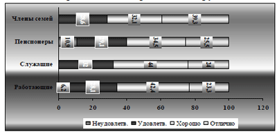 В наших исследованиях значимой корреляционной зависимости между уровнем образования пациентов и их удовлетворенностью качеством медицинской помощи не было установлено (г=-0.1). Особый интерес представляют медико-социологические данные опрашиваемых о самооценке уровня их здоровья. Среди респондентов, находящихся на лечении в госпитале, оценили свое здоровье как «плохое и очень плохое» 24.8% пациентов, а каждый второй (49.7%) как «удовл.». Только 18.2% анкетируемых отметили хороший уровень состояния здоровья и 3.5% указали на «отличное» здоровье. При этом 3.8% затруднились с ответом. В наших исследованиях было установлено, что между уровнем самооценки своего здо-ровья и оценкой восприятия качества медицинской помощи, оказываемой в госпитале, не существовало выраженной корреляционной зависимости -(г = 0.1). Это говорило о том, что мы могли не учитывать влияния такого важного субъективного фактора, как самочувствие пациента, на общий уровень удовлетворенности качеством медицинских услуг. Первые ранговые места среди основных причин обращений пациентов за медицинской помощью в течение последнего года занимают: «необходимость направления на стационарное лечение» - 25.2+1.9% случаев; «про-филактические осмотры» - 16.0+1.7% и «опасение за свое здоровье» - 14.5+1.6%. При этом следует принять во внимание тот факт, что удельный вес причин обращений к врачу в связи с профилактическими осмотрами может быть реально больше за счет доли ответов, отражающих необходимость направления на обследование за пределы части (9.0+1.3%) и направление на консультацию к врачу-специалисту (9.4+1.3%). Оценка структурного компонента качества медицинской помощи показала, что подавляющее большинство респондентов высоко оценили материально-технические, финансовые и кадровые ресурсы госпиталя (табл.2). Доля анкетированных, отметивших качество структурного компонента как «отличное», составила в различных группах от 54.5+9.2% до 76.0+8.5% без значимых статистических различий. Каждый третий пациент (31.8+2.6%) оценил уровень структурного компонента на «хорошо». Вместе с тем особое внимание необходимо об-ратить на те группы респондентов, которые оценили уровень структурного компонента качества медицинской помощи как «удовлетворительный» или «неудовлетворительный».
