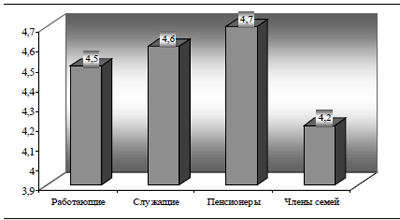 Рис. 3. Распределение оценок удовлетворенности качеством структурного компонента медицинской помощи в различных группах анкетируемых.