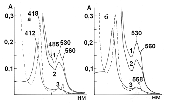 Рис.1 Оптические спектры поглощения изоформ NADPH оксидазы из сыворотки и ЭМ ПКЖ и ВКЖ. а - спектры NADPH оксидаз из сыворотки ПКЖ (1), из сыворотки ВКЖ (2) и (3) после разбавлвния 1-ого или 2-ого и восстановления дитионитом натрия (- - -). б - спектры NADPH оксидаз из сыворотки ВКЖ (1), из сыворотки ВКЖ (2) и (3) после разбавлвния 1-ого или 2-ого и восстановления дитионитом натрия (- - -). Перед регистрацией оптических спектров поглощения растворы NADPH оксидаз из ЭМ ПКЖ и ВКЖ были разбавлвны 0,2 м калий фосфатным буфером (рН 7,4) в 3 раза.