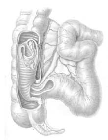 Необходимо учесть также возможность хронической инвагинации. Для желудочно-кишечного тракта характерна периодическая моторная деятельность в виде чередования, через каждые 90 ми-нут, фазы покоя, (длящейся 30-40 минут), нерит-мичных сокращений (20-30 минут) и фазы ритмичных сокращений, или фронта активности (6-12 минут) [2]. После илеоцекальной инвагинации именно в фазу ритмичных сокращений подвздошной кишки и баугиниевой заслонки периодически возникает препятствие для кишечного пассажа, что и вызывает схваткообразные боли. Возникает клиника пе-риодически рецидивирующей, хронической кишечной непроходимости. На то указывают случаи илеоцекальной инвагинации с длительным анамнезом, когда во время операции (лапаротомии) невозможно было дезинвагинировать подвздошную кишку из-за спаечного процесса между цилиндрами инвагината. Длительная постепенная инвагинация подвздошной кишки в слепую с ишемией, повреждением брыжейки петель кишок и развитием вследствие этого спаек между цилиндрами инвагината приводили к фиксации, вследствие чего стало невозможной дезинвагинация. Таким образом, у вышеуказанных больных можно предположить наличие длительной хрониче-ской илеоцекальной инвагинации, что наряду со спаечной болезнью живота обусловило клинику кишеч-ной непроходимости.