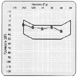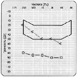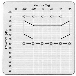 Рис 3. Аудиограмма, представляющая пример смешанной потери слуха.