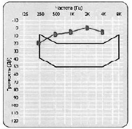 Скобки обозначают пороги костной проводимости, кружочки - пороги воздушной проводимости. Полезные речевые звуки находятся в зоне, обведенной черным. По горизонтали - частота в Гц. По вертикали -уровень слуха в дБ.