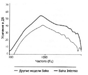 Новая модель ВАНА “Ь^епво” компенсирует до 55 дБ ПС сенсоневральной потери слуха. Как показано на рисунке 5, "Intenso" дает на 10-15 дБ больше усиления для пациента, благодаря использованию более мощного преобразователя и активной системы нейтрализации самовозбуждения.