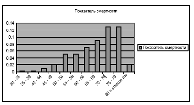 Результаты и обсуждение. Показатели смертности среди больных РЩЖ значительно ниже показателей заболеваемости. В целом, уровень смертности от тиреоидного рака сравнительно низкий, он составляет менее 1% всех смертных случаев от злокачественных новообразований. Медиана выживаемости составила 3,5 лет (диапазон от 1 месяца до 20 лет). Среднегодовой показатель смертности от рака щитовидной железы составляет 0,02±0,008 (М=7), а пока-затель летальности р = 16,25 на 100 больных. Среди 85 умерших женщин было 58 (68,2%±5,05), мужчин - 27 (31,8%±5,05). Показатель смертности выше у женщин 0,03±0,01, а у мужчин 0,01±0,008. Разница между показателями статистически достоверна (р ‹ 0,001). Возраст этих лиц обобщен в таблице 1. Самая высокая летальность приходится на людей в возрасте 70-79, то есть на людей пожилого и старческого возраста.