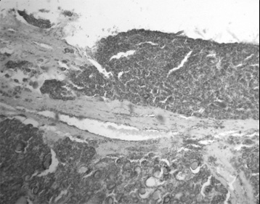 Рисунок 1. Широкий инвазивный рост в фиброзную капсулу при фолликулярном раке щитовидной железы с экстратиреоидным распространением. Окраска гематоксилином и эозином. X 400.