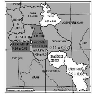 Как видно из указанной таблицы показатели смертности практически одинаковы во всех марзах Республики Армения. Разница между показателями частоты метастазирования у населения в различных марзах статистически не достоверна (р > 0,05). Как указывала Э.А. Сафразбекян (Ереван, 1972) в свой диссертационной работе “Йод в почвах Армянской ССР” во всех типах почв Армении наблюдается низкое содержание водорастворимого йода.