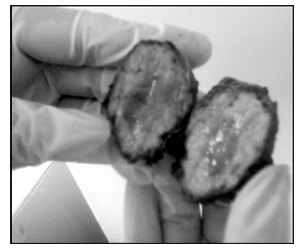 Рис. 1. Фолликулярный вариант папиллярного рака левой доли щитовидной железы на фоне тиреоидита Хашимото. Макропрепарат. История болезни N6292/1072. В.Р., 41 лет.