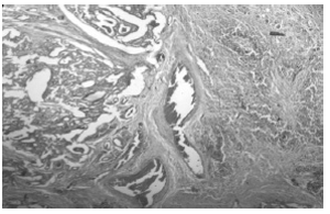 Рис. 2. Сочетание фолликулярного рака щитовидной железы с аутоиммунным тиреоидитом Хашимото. Окраска гематоксилином и эозином. X 400.