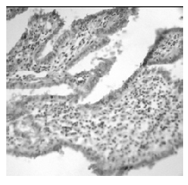 Рис. 4. Лимфоцитарная инфильтрация сосочковых структур при папиллярном раке щитовидной железы. Окраска гематоксилином и эозином. X 600.