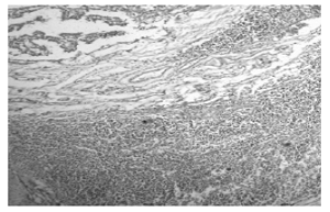 Рис. 5. Лимфоцитарная инфильтрация в окружающей папиллярный рак ткани щитовидной железы. Окраска гематоксилином и эозином. X 400.