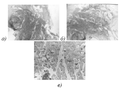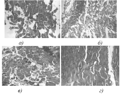 Результаты и обсуждение. Гистологическое исследование препаратов контрольной группы показало, что механическое повреждение мышечной ткани не привело к особым структурным изменениям (рис.1а,б). В размозженных участках мышечной ткани сохранены характерные структурные особенности. Эндомизий и перимизий окрашиваются в красный цвет, а мышечные волокна - в буроватый и