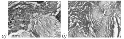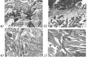 Спустя месяц высокая активность СДГ выявляется в участках с продолжающимися процессами регенерации. В целом на протяжении всего препарата активность фермента приближается к норме. В отличие от контрольной группы животных, при изучении морфоструктуры, в препаратах II и III групп, с обработкой раны различными концентрациями препарата “Капрофер”, уже после 6-12 часовой экспозиции препарата отмечались выраженные деструктивные изменения (рис. 3а,б): разжижение волокон, атрофия и дистрофия, скопление нейтрофильных лейкоцитов, очаги кровоизлияния. Описанная картина менее выражена при концентрации 1:100.