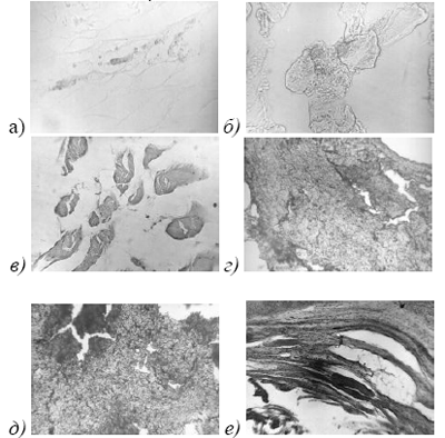 После 24 часовой экспозиции между расслоив-шимися мышечными волокнами и обрывками вы-являлось проникновение клеточных форм соединительной ткани, большое количество нейтрофильных лейкоцитов. А окраска по Ван-Гизону позволила вы-явить нежные волокна соединительной ткани между обрывками мышечных волокон (рис. 3в,г). Анализ гистограмм на срок 1 месяц после обработки показал, что дефекты мышечной ткани заполнены соединительной тканью разной степени зрелости: от