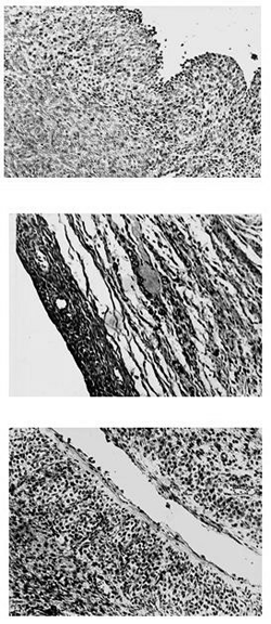 • б - атрофическая theca intema кистозно измененного фолликула, выраженная атрофия с явлениями отека межуточной ткани
