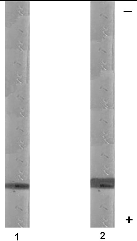 Рис. 1. Электрофореограммы еNох (5мкг и 10мкг) из сыворотки донорской крови (1) и из асцитной жидкости карциномы яичника женщин (2)