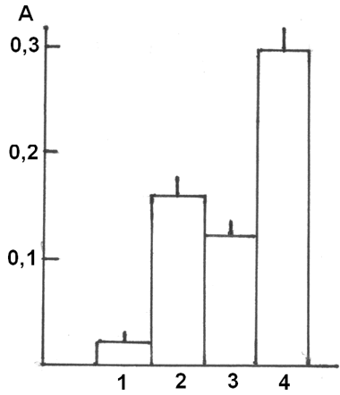Рис. 2. Удельное содержание eNox (плотность оптического по-глощения β-полосы 530нм): из донорской крови, без инкубирования (1) и после инкубирования Hb (до 10x10-6М) in vitro (2), из жидкости асцитной карциномы яичника женщин с давностью заболевания 1,2 года (3) и 3,5 года (4)