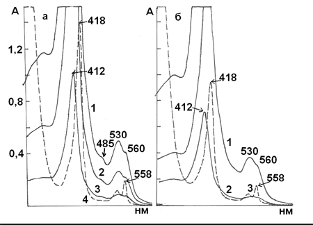 Рис. 3. Оптические спектры поглощения eNox: а - в окисленном состоянии, из асцитной жидкости карциномы яичника женщин с давностью заболевания 3,5 года (1) и 1,2 года (2); после разбавления последнего 0,04 М КФБ (3) и восстановления дитионитом натрия (4). б - спектры Nox из клеточных компонентов селезенки, костного мозга и эритроцитарных мембран крыс в окисленном состоянии (на примере Nox из мембран клеток селезенки); после разбавления последнего (2) и восстановления дитионита натрия (3). Приведены характерные максимумы оптического поглощения Nox и еNoх.
