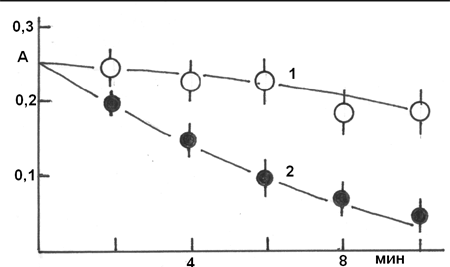 Рис. 5. Кинетические кривые снижения плотности оптического поглощения еМох из донорской крови или из асцитной жидкости карциномы яичника женщин под влиянием 2x10-3М Н202 (1). Аналогичные показатели получаются для Мох из клеточных компонентов селезенки, костного мозга и эритроцитарных мембран (на примере Nох из мембран клеток селезенки крыс) (2). Белки растворены в 0.04 М КФБ