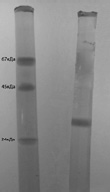 Рис.2.Электрофореграмма галектина 3 в ДДС ПААГ, в 7% ПААГ маркеры-БСА (67 кДА), овальбумин (45 кДА) и трипсин (24 кДА)