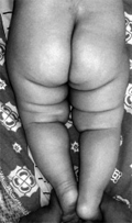 Клинический метод в диагностике ВВБ. Trendelenburg F. в 1897г. описал симптом несостоятельности средней и малой ягодичных мышц при ВВБ, который в настоящее время носит его имя (рис.1). На сегодняшний день тест применяется достаточно широко у больных после начала ходьбы, однако положительный тест может являться не только признаком ВВБ, но и других заболеваний, а в некоторых случаях встречается и у здоровых людей [45]. Ранним симптомом ВВБ у грудных детей Baden P. (1907) считал асимметрию кожных складок на передней и задней поверхности бедер. В норме у ребенка имеется шесть кожных складок на переднемедиальной поверхности бедра: паховая, аддукторная и надколенная, а на задне-медиальной: ягодичная, бедренная и подколенная. При дисплазии и ВВБ кожные складки располагаются асимметрично или имеется дополнительная кожная складка (рис.2). Hilgenreiner (1925) и Маркс В.0. (1984) отмечали, что асимметрия кожных складок не является достоверным симптомом, так как наблюдается и у детей, у которых нет дисплазии или вывиха ТБС [7,17]. Joachimstahl G. в 1908г. впервые отметил ограничение пассивного отведения бедер у грудных детей, как признак ВВБ. В норме у новорожденного при отведении в тазобедренных суставах (ТБС), наружные поверхности бедер должны касаться поверхности стола, в более позднем возрасте при нормальных соотношениях в ТБС отведение составляет не менее 600 (рис.3). Выраженность ограничения разведения зависит от стадии развития патологии и его продолжительности: чем больше времени проходит, тем больше она нарастает [1,17,21,23,27,28,66]. Симптом особенно информативен при одностороннем поражении, и у детей старше 3 месячного возраста [7,50].